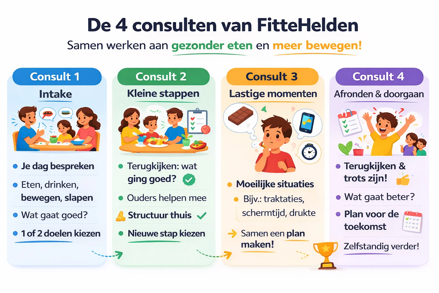 Samen met de diëtist leer je in 4 consulten wat je eet of dat gezond is en wat eventueel gezonder kan. Ook bespreek je hoeveel je beweegt, slaapt, drinkt en op de tablet/telefoon zit. De adviezen die de diëtist geeft passen we aan op jullie thuissituatie, zodat ze echt haalbaar zijn.